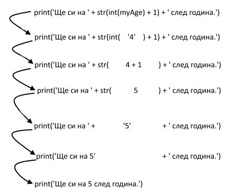 Нека потребителят е въвел низа '4' за myAge. Низът '4' се конвертира до цяло чилсо, за да може да се прибави единица към него. Резултатът е 5. Функцията str() преобразува резултата отново в низ, за да може да се слепи с останалите низове. Така се постига крайната цел - показване на цялото съобщение. Стъпките по време на пресмятането изглеждат по подобен начин :